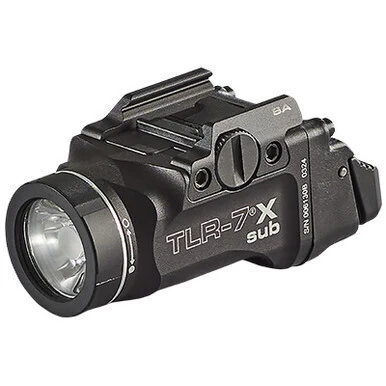 The Streamlight TLR-7 X Sub Tactical Gun Light is designed for subcompact handguns. These lights are now multi-fuel, they will accept one Streamlight SL-B9 USB-C rechargeable battery OR one CR123A lithium battery. It produces 500 lumens and easily attaches to the rail system of your handgun. Activate the light with the ambidextrous rear switch.